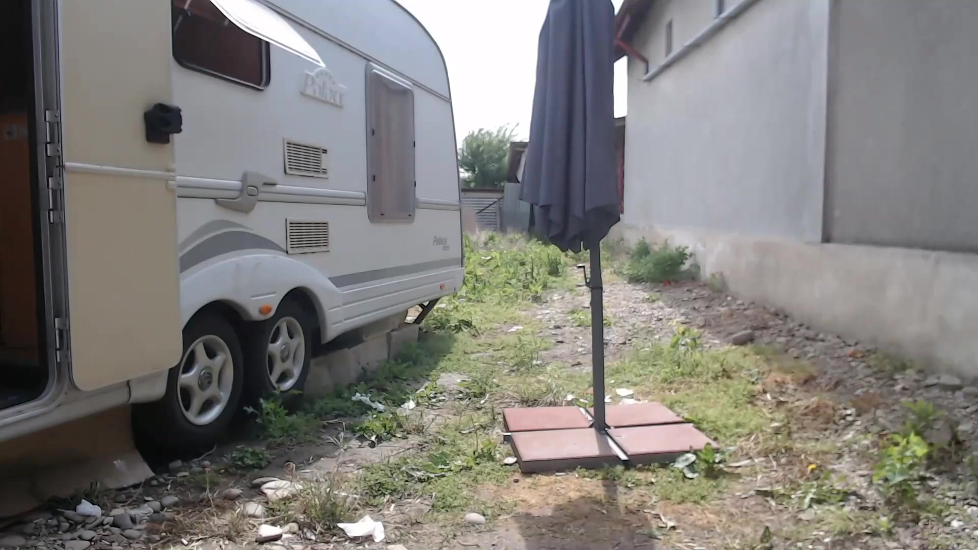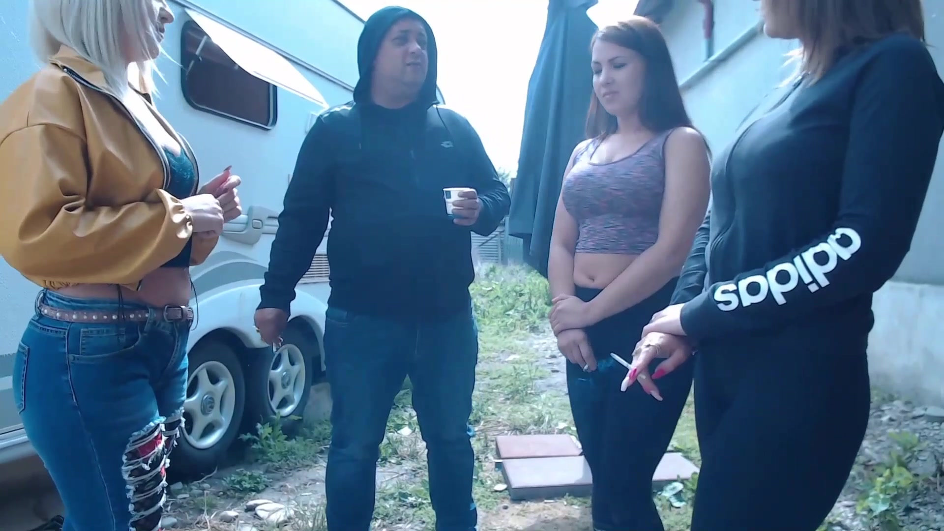 Average looking Russian girls playing outside motor home behind the back of some dude who is probably their “father”.